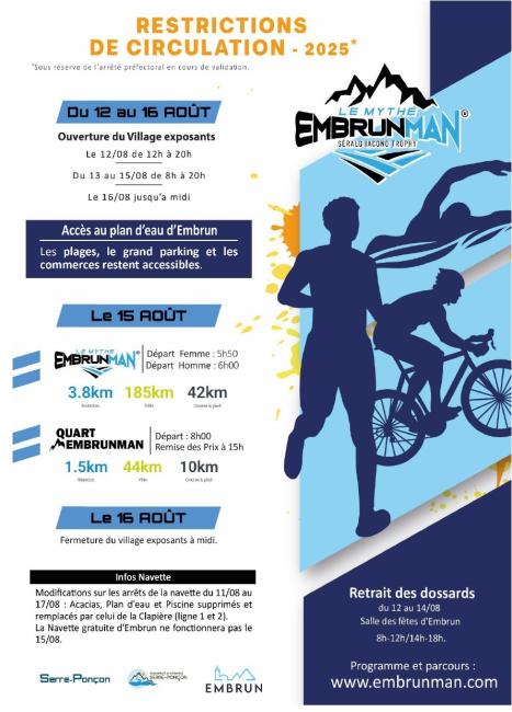 Pour le bon déroulement des différentes épreuves de l'Embrunman 2025, la ville d'Embrun vous communique le programme, les restrictions de circulations et informations pratiques.